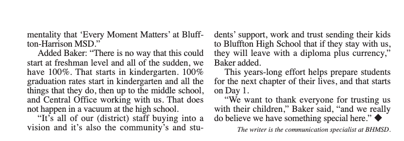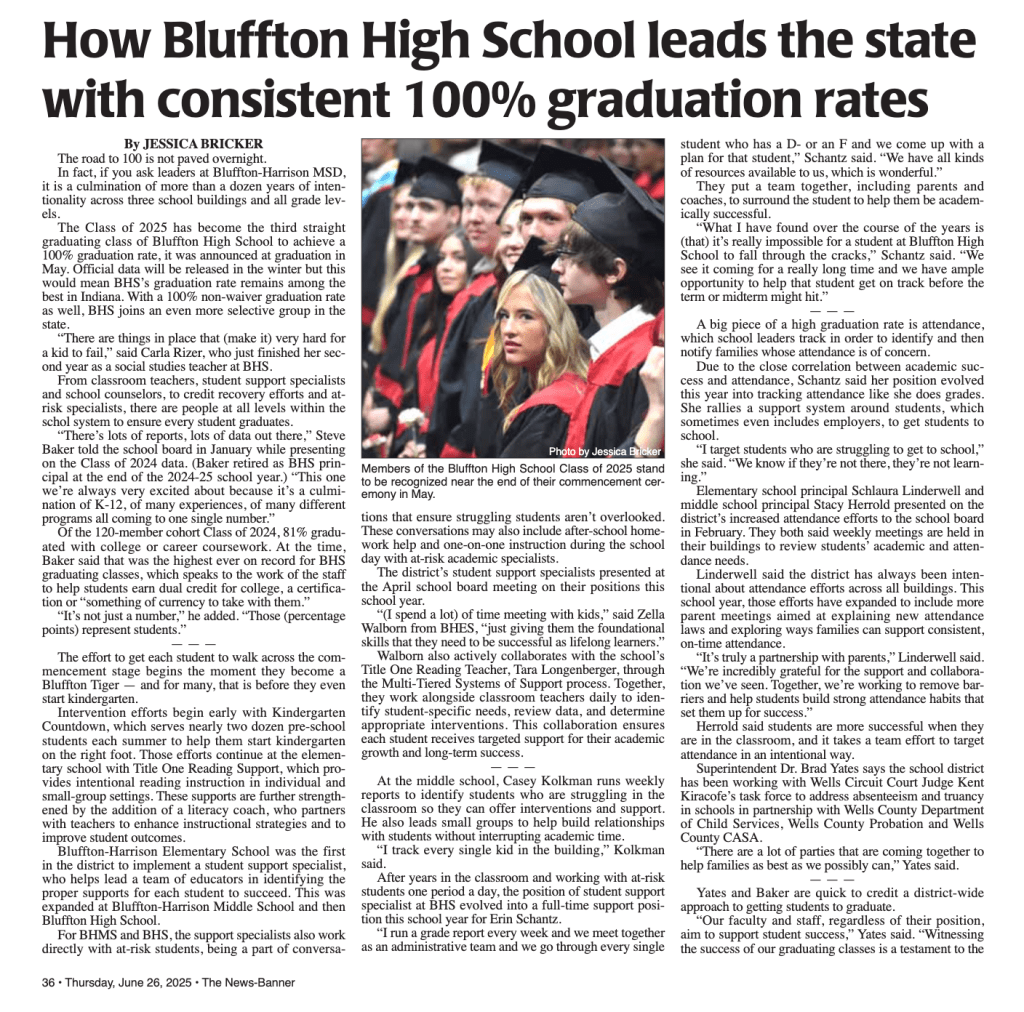 How one Indiana public school district achieves a 100% graduation rate Posted byJessica Williams BrickerJuly 1, 2025September 14, 2025Posted inMy work As published in Bluffton (Ind.) News-Banner. (All rights reserved.) Share this: Share on X (Opens in new window) X Share on Facebook (Opens in new window) Facebook Email a link to a friend (Opens in new window) Email Like Loading... Related Published by Jessica Williams Bricker I'm a boy mom and a storyteller. I graduated from Indiana University in 2013 with a journalism degree with minors in history and political science. View more posts