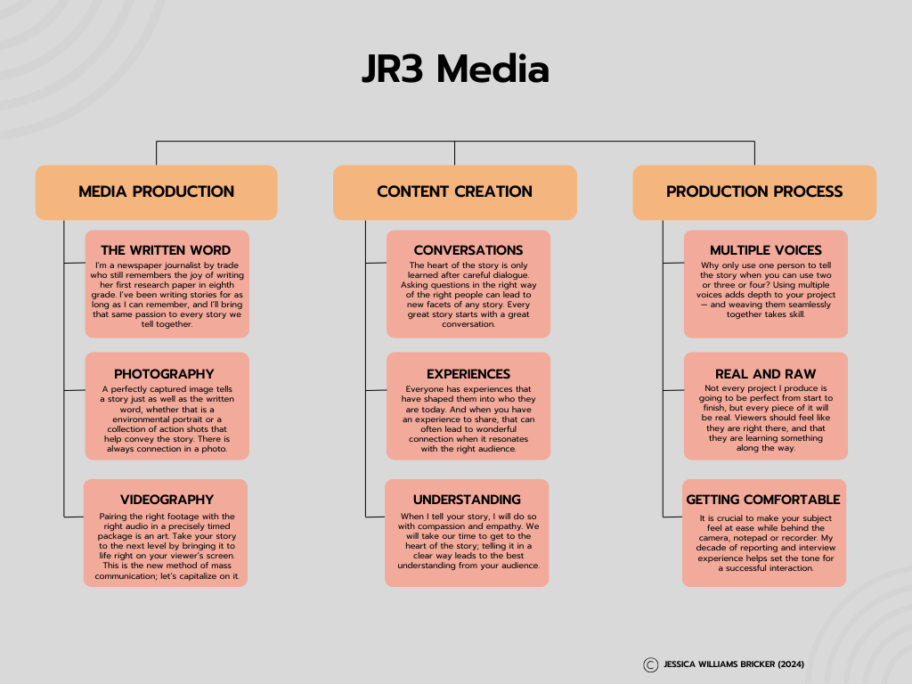 In the fall of 2024, I introduced JR3 Media, my three-pronged approach to media: Writing, Photography and Videography. My plan is to share stories from across our community under the JR3 Media umbrella.